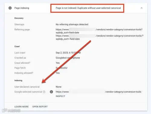 Pages 报告中一个不太明显的内容称为“没有用户选择的规范网页的重复”,其中 Google 找到了两个内容相同的网页,并选择将其中一个编入索引。网址检查工具会识别重复的网页。点击报告中的其中一个网址,然后点击“检查网址”。