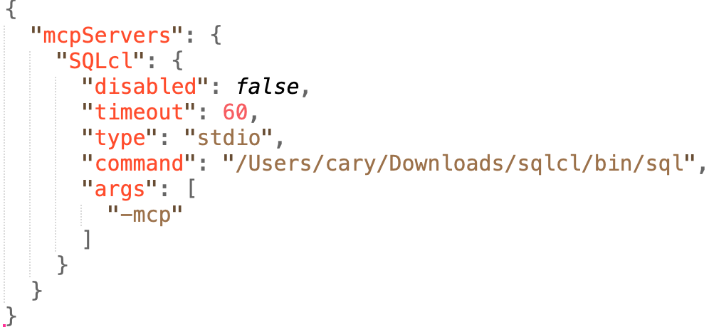 我们来看看一个JSON的实际例子(没错,眼尖的人已经看出来这是SQLcl工具支持MCP Server的一个配置文件):