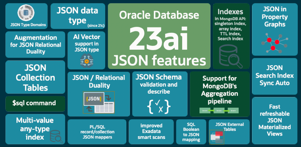 一提到Oracle的JSON支持,大家都会想当然的想到JSON关系二元性,但是Oracle对JSON的支持是全方位的,来看看Oracle Databse 23ai 中的JSON 相关的功能全景图吧。