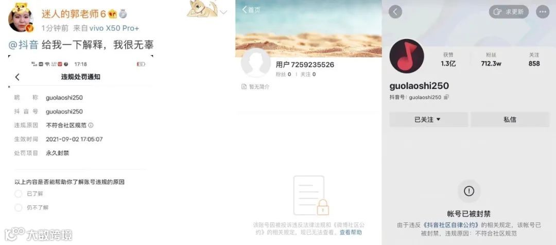 9月2日,拥有700万粉丝的网红“郭老师”在微博透露其抖音账号遭永久封禁。随后,网友发现其微博与快手账号亦被封禁,引发广泛关注[k]。