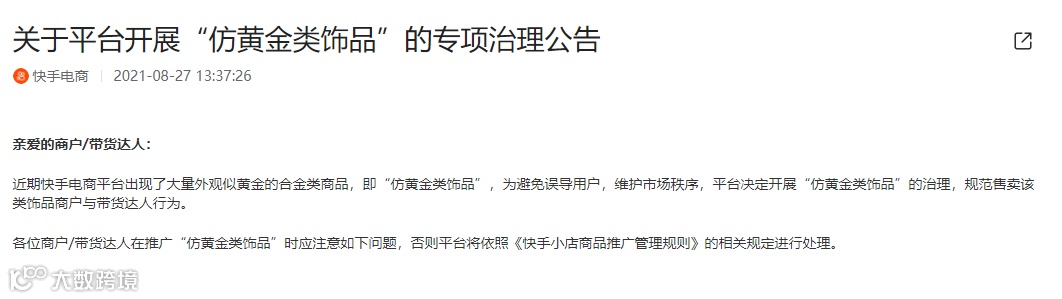 8月30日,快手电商发布“仿黄金类饰品”专项治理公告,自8月26日起执行[k]。