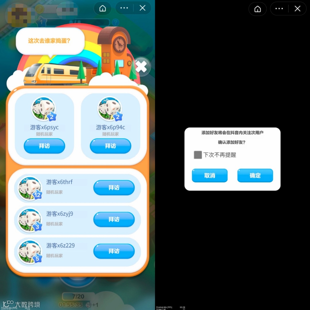 社交功能方面,用户可邀请好友或添加陌生人为好友参与游戏;还可进入随机玩家“家中”进行“捣蛋”,成功可获得金币与经验,失败则被捕回家。每人每两小时恢复一次投掷机会,最多可投掷20次。游戏支持跳转至对方抖音主页关注或添加好友,旨在提升用户间互动与连接[k]。