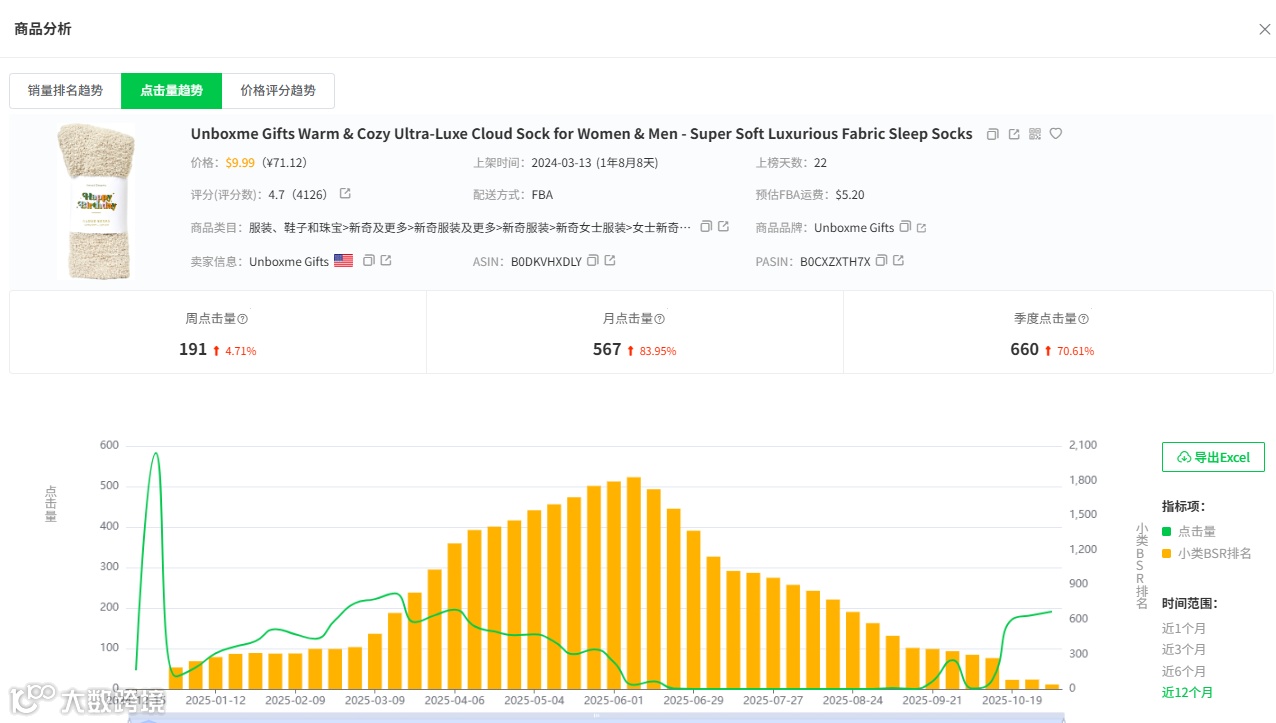 2、季节性因素:该产品为 “保暖袜”,属于季节性商品,随着秋冬临近,自然搜索量和点击量会因季节性需求上升而显著增长。