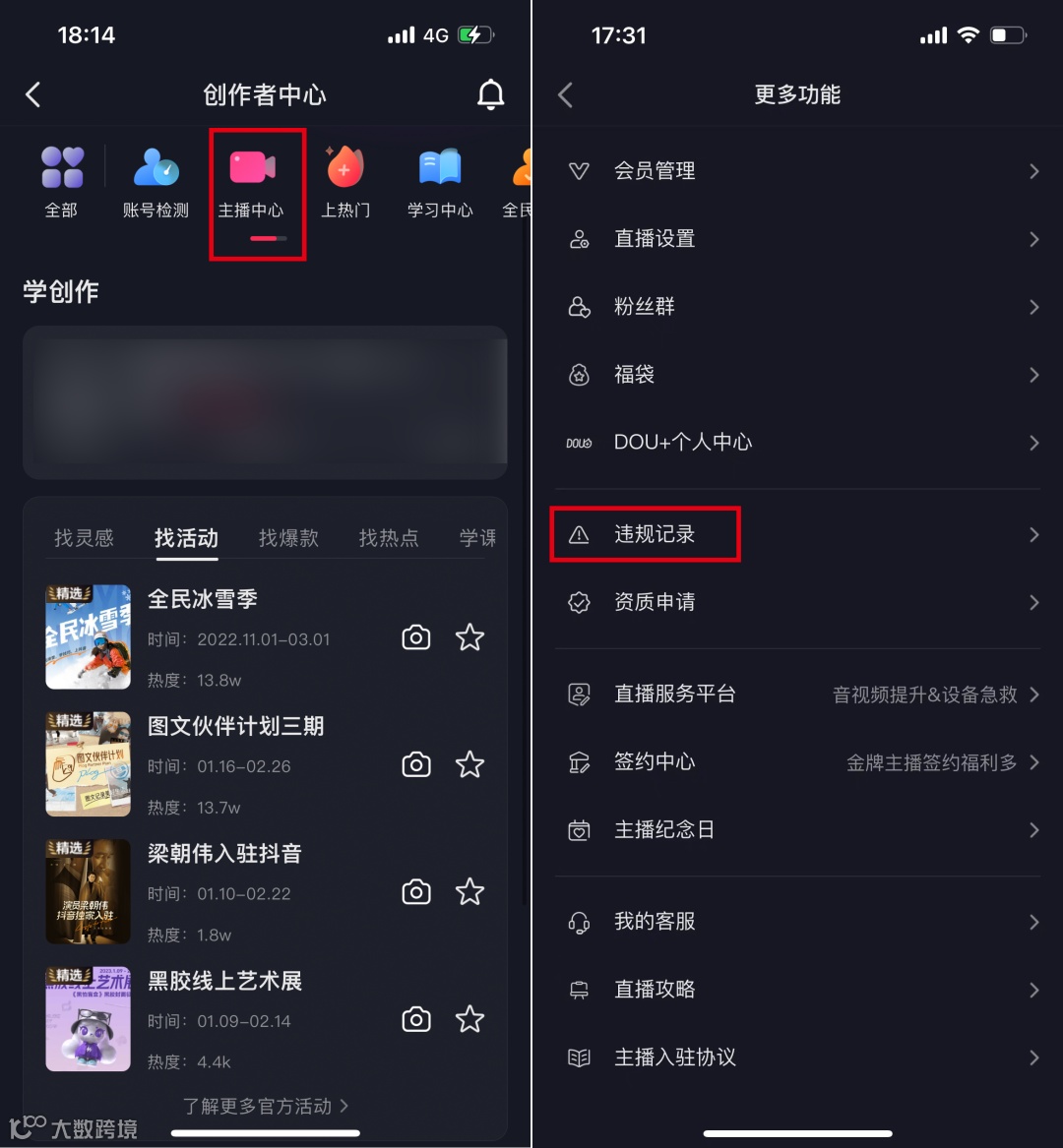 - 进入【我的】→【创作者服务中心】→【主播中心】→【违规记录】查询历史处罚及扣分情况[k]。