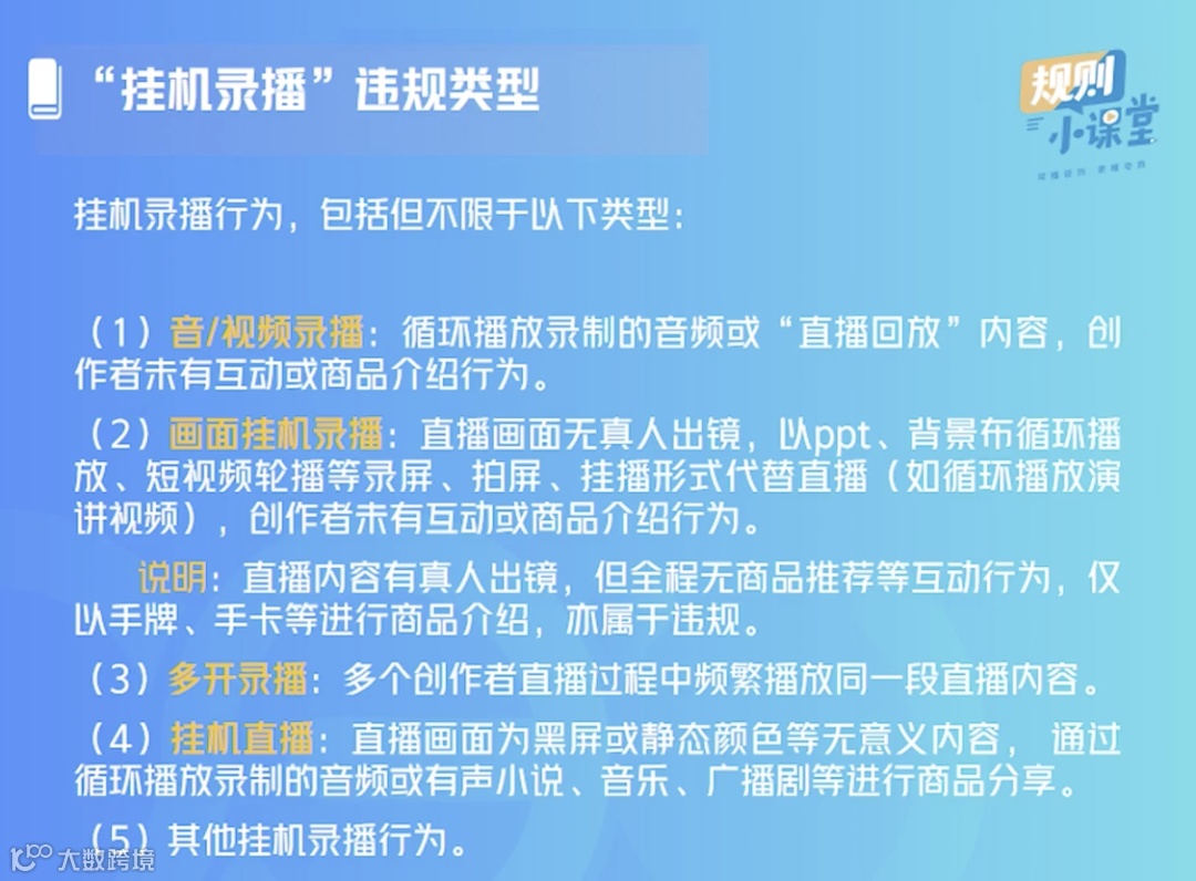 平台严厉打击挂机录播、低画质、零互动等行为。所谓“挂机录播”,即通过播放录制视频或音频,长时间无真人出镜、讲解与互动的方式进行商品推广,属严重违规行为[k]。