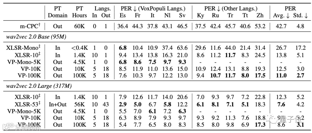 实验证明,基于VoxPopuli训练的模型在少样本语音识别任务中表现优异,VP-Mono5K和VP-100K在多数语言上优于XLSR系列模型,展现出强大的语音表征通用性[k]。