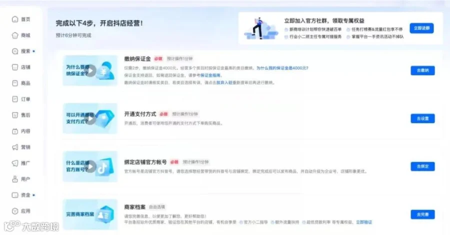 按提示完成缴纳保证金、开通支付方式、绑定官方账号等后续操作,店铺即正式开通[k]。