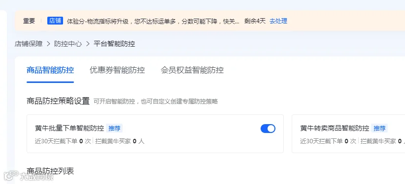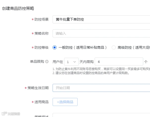进入“店铺保单防控中心”,开启“商品智能防控”并创建自定义策略。建议设置为“一般防控”,限购1-2件,覆盖全店商品,防止羊毛党薅取优惠[k]。