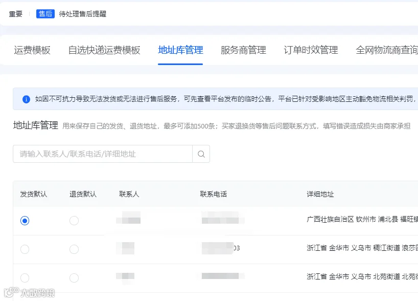 在“地址库管理”中添加退货地址。若为无货源模式,可设置多地址退货,便于商品直接退回供应商[k]。