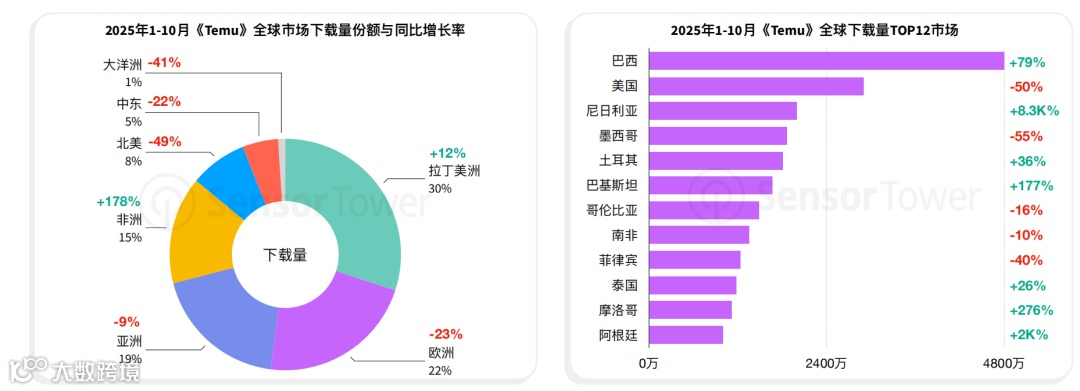 2025年,Temu的全球化布局迎来关键战略转折。数据显示,其在拉美、非洲等新兴市场的下载量呈爆发式增长,与欧美成熟市场的表现形成强烈反差。截至2025年10月,Temu全球累计下载量已突破12亿次,同年8月全球月活跃用户(MAU)规模达5.3亿。其中,拉丁美洲以30%的下载量占比领跑全球市场,成为其增长的核心引擎之一。