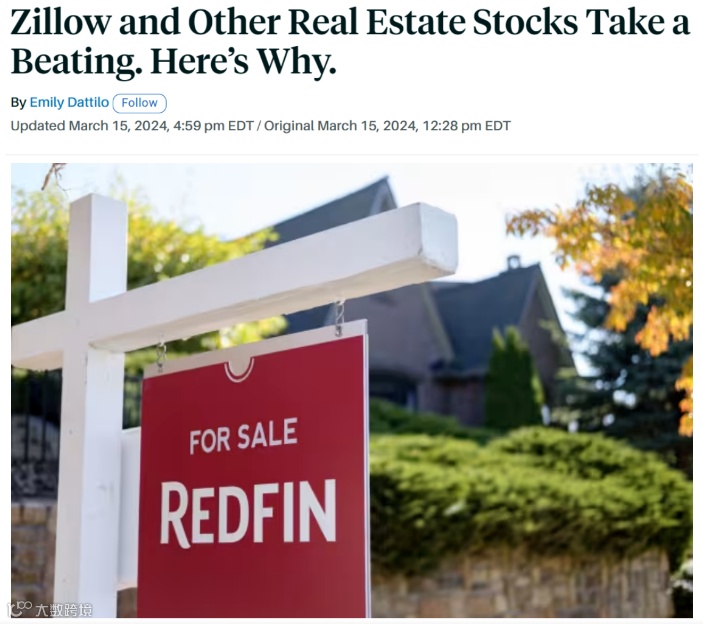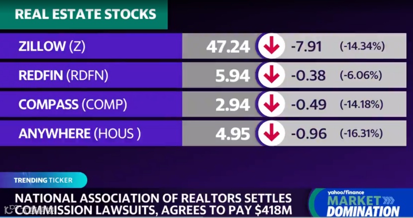 NAR宣布和解后,美股房地产相关企业股价集体下挫。根据道琼斯市场数据,Zillow(X)股价当日一度下跌约16%,Anywhere Real Estate(HOUS)跌15%,Compass(COMP)跌11%,Redfin(RDFN)跌5%[1]。