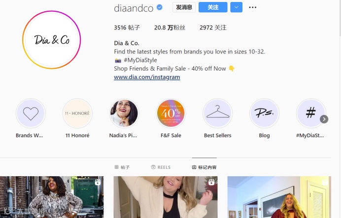 特别是Dia&Co的Instagram账号,拥有20.8万粉丝,分享3516条帖子。最重要的是Dia&Co建立了Dia&Co社区,在社区里,已购买的消费者可以自行交流购买经验、交友,畅所欲言。Dia&Co的Instagram账号主页直接可以看到其他用户带Dia&Co相关话题的帖子,很容易吸引用户点击查看,这无疑是消费者为Dia&Co打的最好的广告。