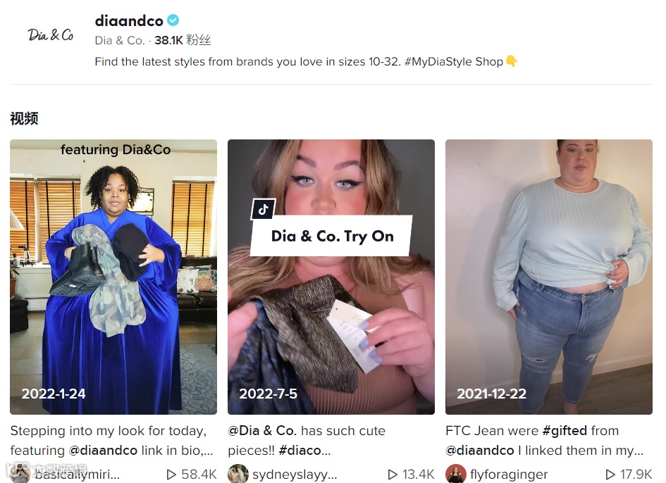 Dia&Co在TikTok上建立官方账号,拥有3.81万粉丝,账号内容主要是新款服装预热、服装上身效果展示等,在TikTok上,也有不少博主购买Dia&Co大码服装,并进行开箱测评,受到海外胖女孩们的欢迎,通过大码博主的测评与种草,提升Dia&Co品牌的曝光率,大大增强Dia&Co的销量。