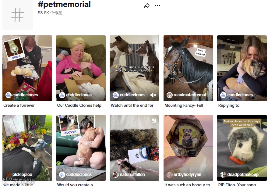 宠物用品的相关视频在TikTok上播放量都很高。#petmemorial、#petgrief等相关话题标签下分别有5.38万条、10.02万条作品,用户分享感人的养宠故事,怀念毛孩子,此类视频热度持续不断。