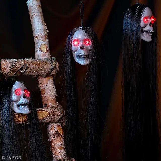 Halloween Hanging Ghost Skull with Long Hair Glowing Eyes Terror Skull Ghost House Head Skeleton Props 2023 Halloween Decoration