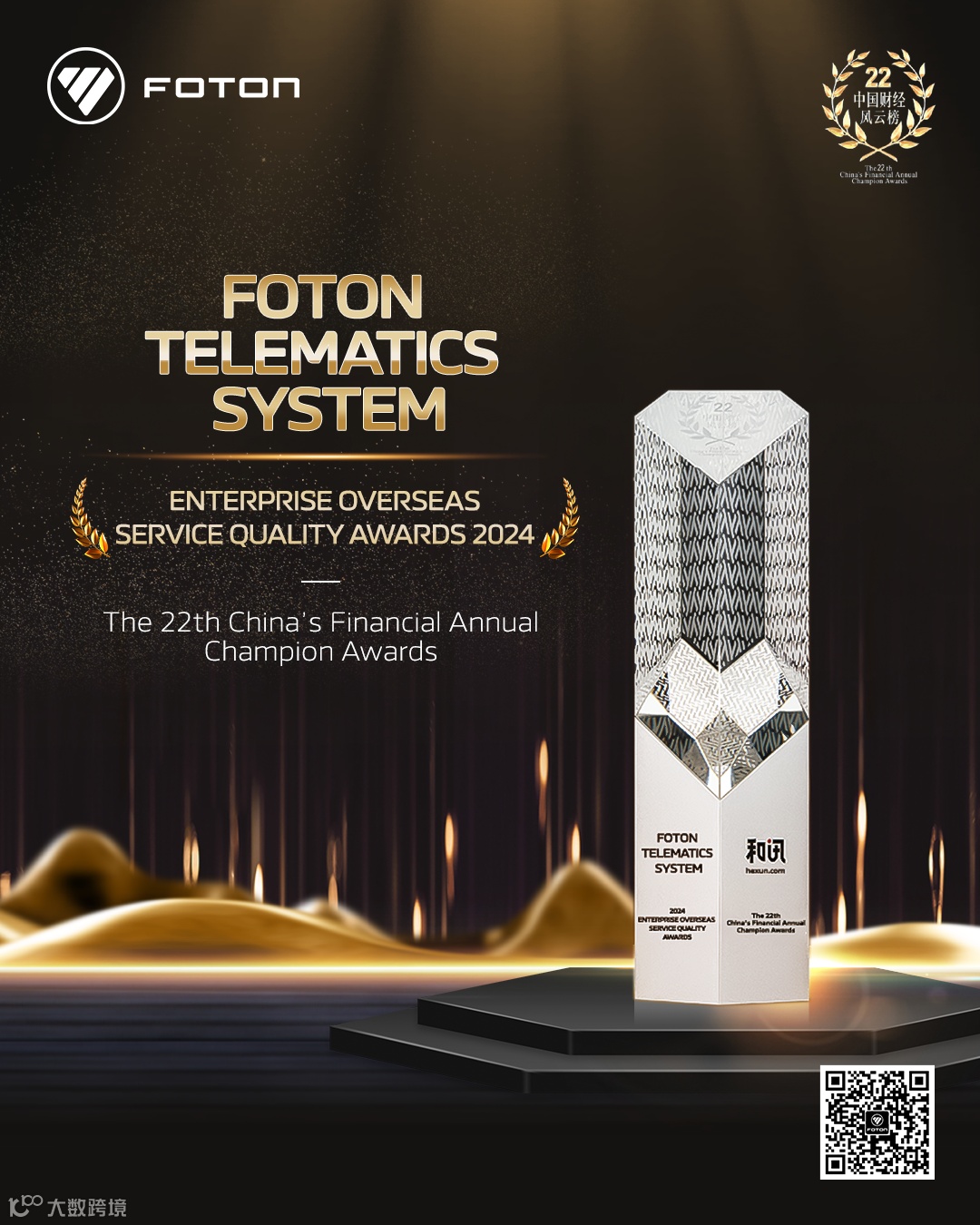 Recently, the much-anticipated award ceremony of "The 22nd Financial Billboard" was held in Beijing, and Foton Telematics System won the award of "Enterprise Overseas Service Quality Awards 2024" for its outstanding performance and technological innovation in the field of global IoV service. The award demonstrates the influence of Foton Telematics System in the international arena.