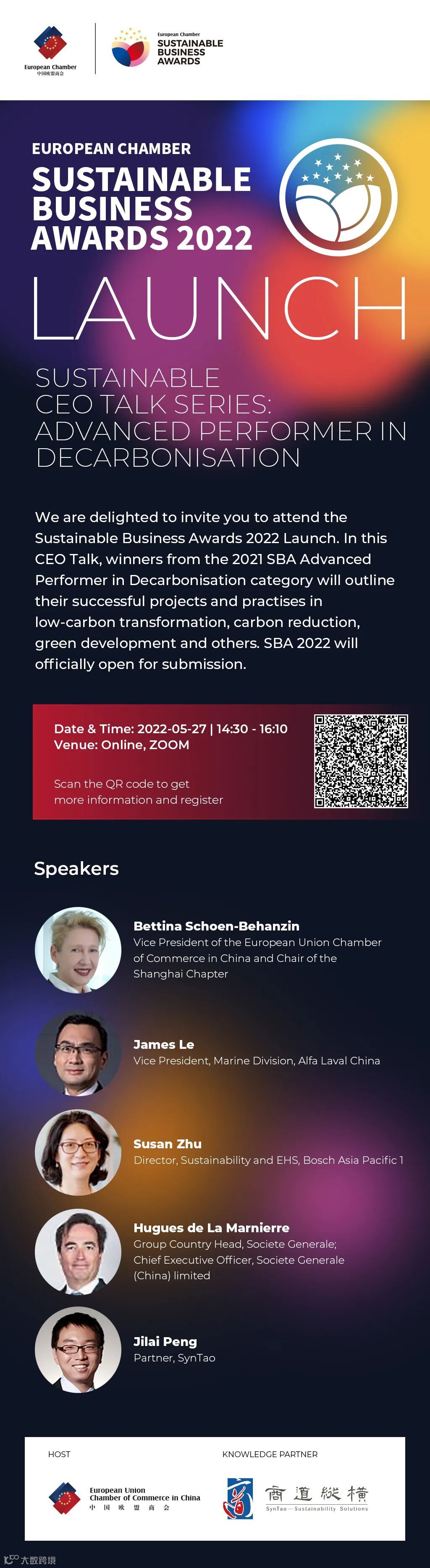 We are delighted to invite you to attend the Sustainable Business Awards 2022 Launch. In this CEO Talk, winners from the 2021 SBA Advanced Performer in Decarbonisation category will outline their successful projects and practises in low-carbon transformation, carbon reduction, green development and others. SBA 2022 will officially open for submission.