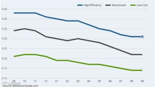 不仅是国内,全球光伏组件价格也一直在下跌。据德国光伏交易平台pvXchange统计,平均而言,所有类别光伏组件的价格已经下跌约10%。在光伏发电的历史上,光伏组件价格从未在如此短的时间内大幅下跌。
