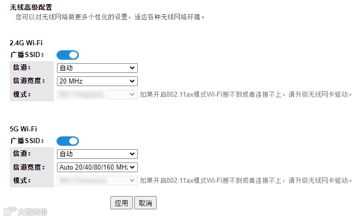 2、在从FTTR web界面导航树中,选择“无线网络 > 无线设置”页签,在左侧导航树中选择“无线网络高级”配置,将2.4G Wi-Fi和5G Wi-Fi的SSID按钮关闭即可。