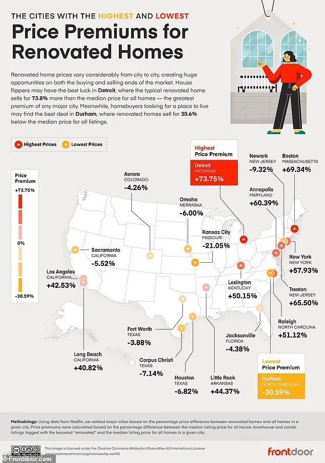 根据房屋维修服务公司Frontdoor对Redfin房源数据的最新分析,密歇根州底特律在翻新房产投资回报方面位居全美榜首[k]。当地典型翻新房屋的售价较区域房价中位数高出73.75%,溢价幅度居所有都会区之首[k]。