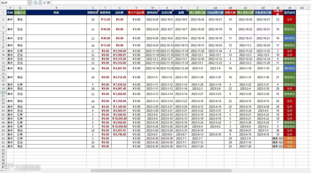 我这里有一个关于旺季的备货表,包含了货物的建单时间、出货时间、提取天数及签收日期,可以看到货物运输的物流状态,是否延误。含有一些计算公式,能够在旺季期间帮助卖家尽快计算物流运输数据。感兴趣的卖家可以扫描文内二维码私信领取表格~