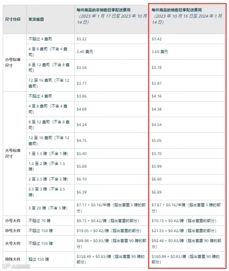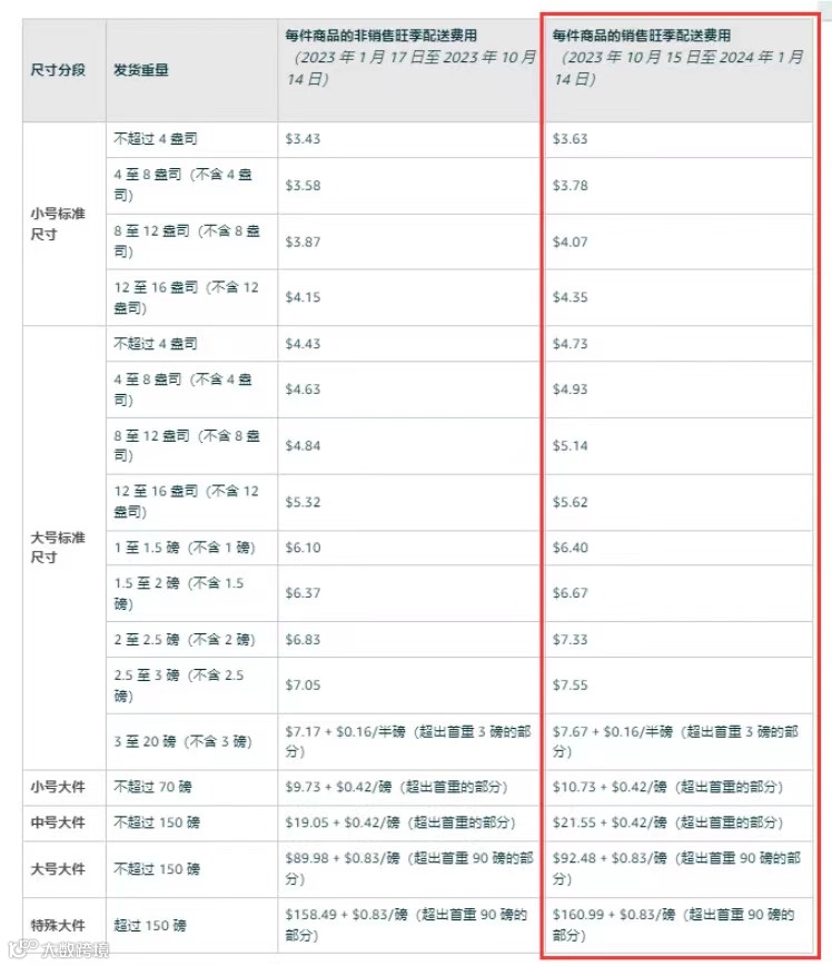 亚马逊宣布年度假日高峰配送费上调,新的费率将从2023年10月15日至2024年1月14日期间生效。
