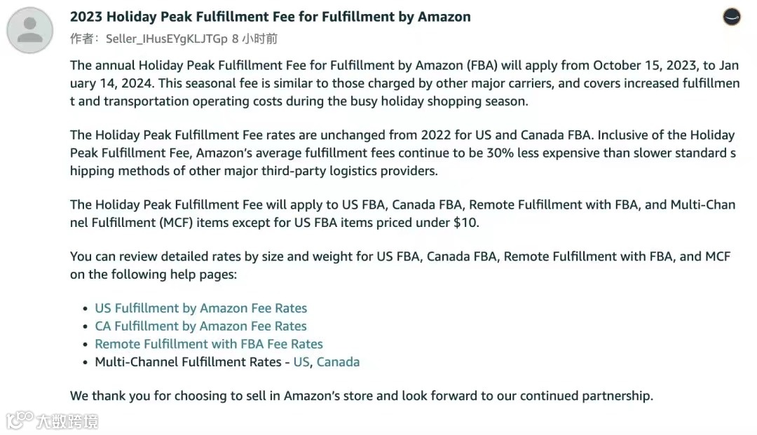 今年的假日高峰配送费用将适于美国FBA、加拿大FBA、亚马逊远程配送计划和多渠道配送(MCF)。值得注意的是:定价低于10美元的美国FBA商品不包括在内。(定价低于10美元以下的商品卖家在此刻长舒了一口气.....10美元以上的卖家喷出一口老血。)