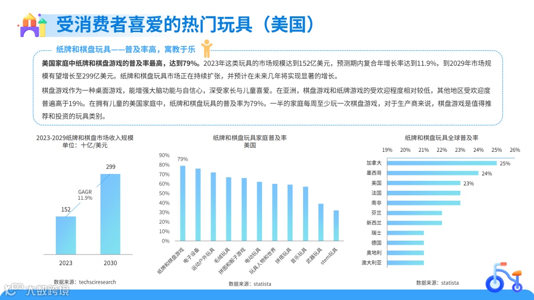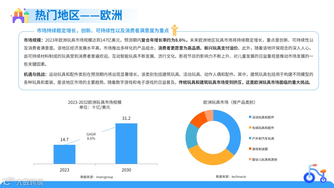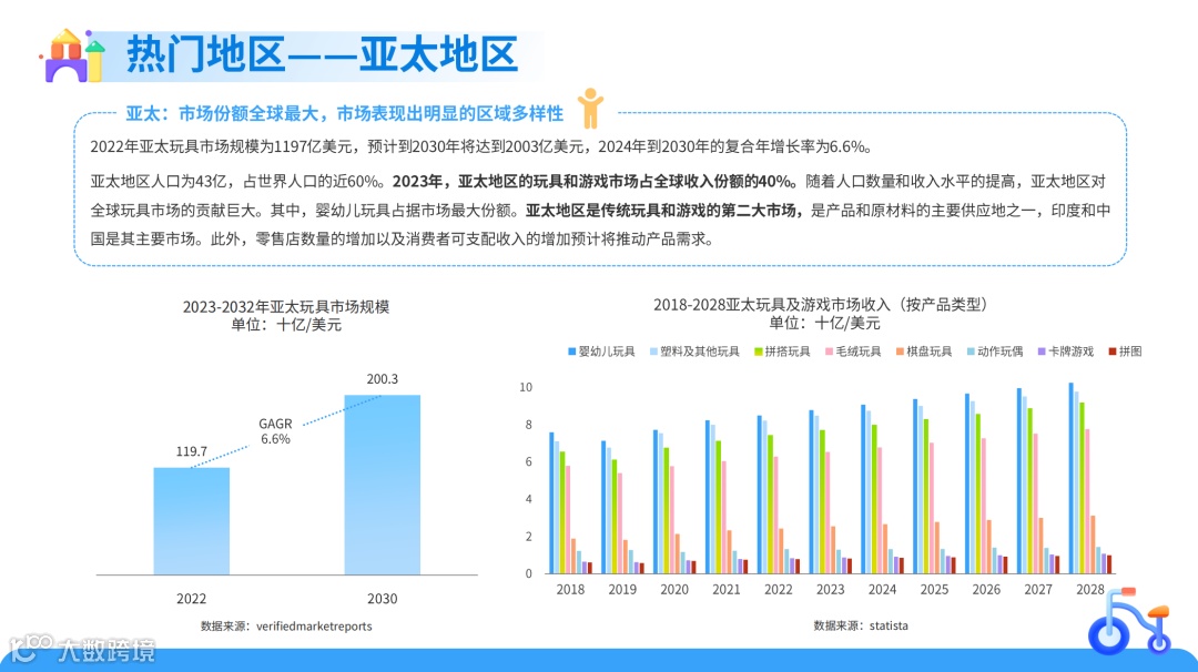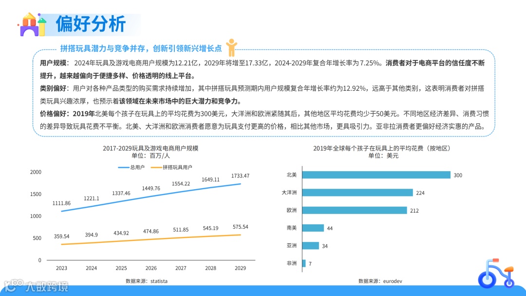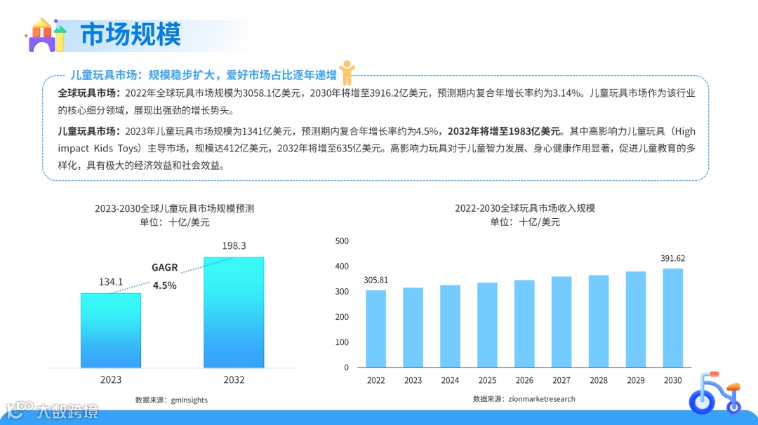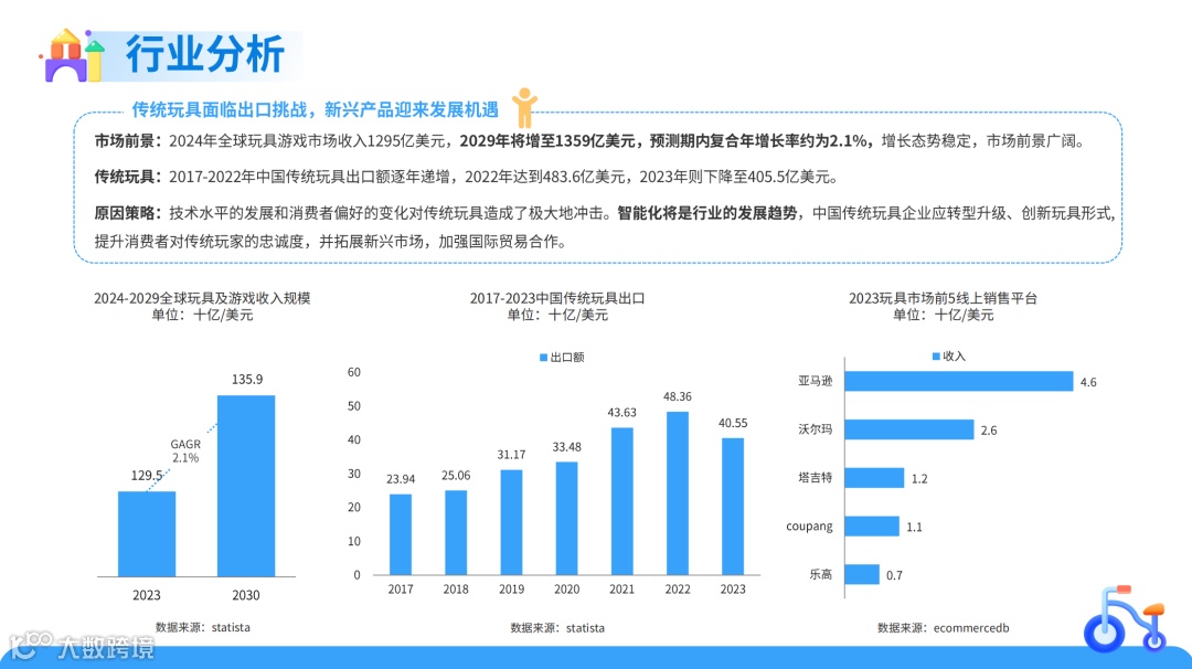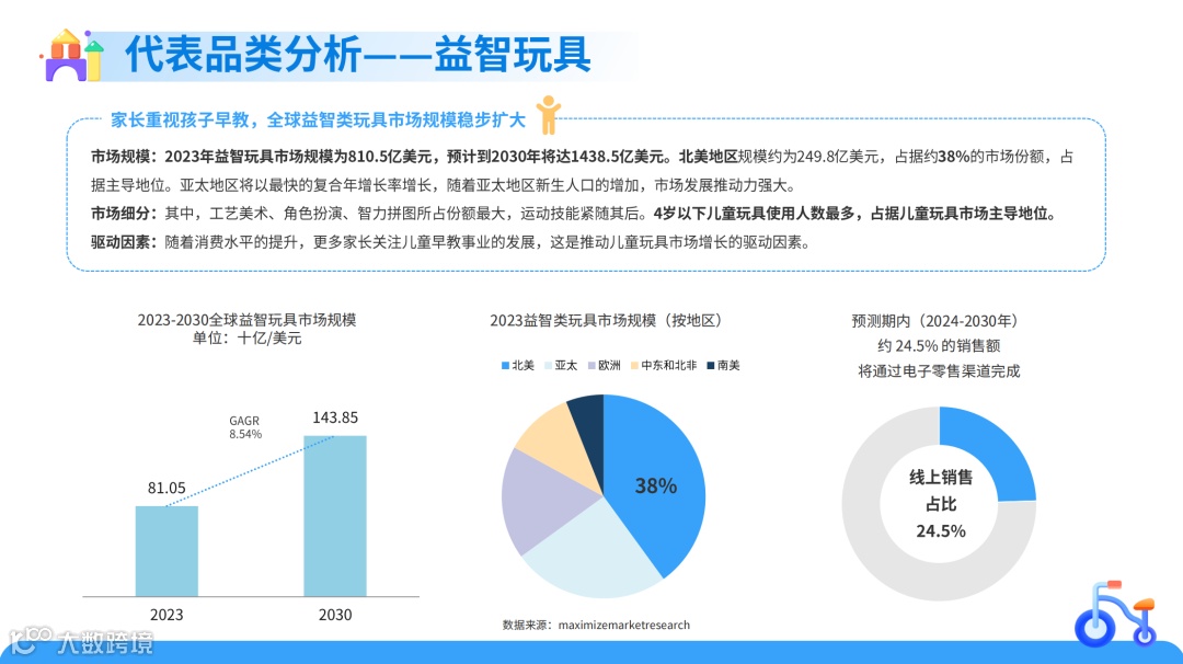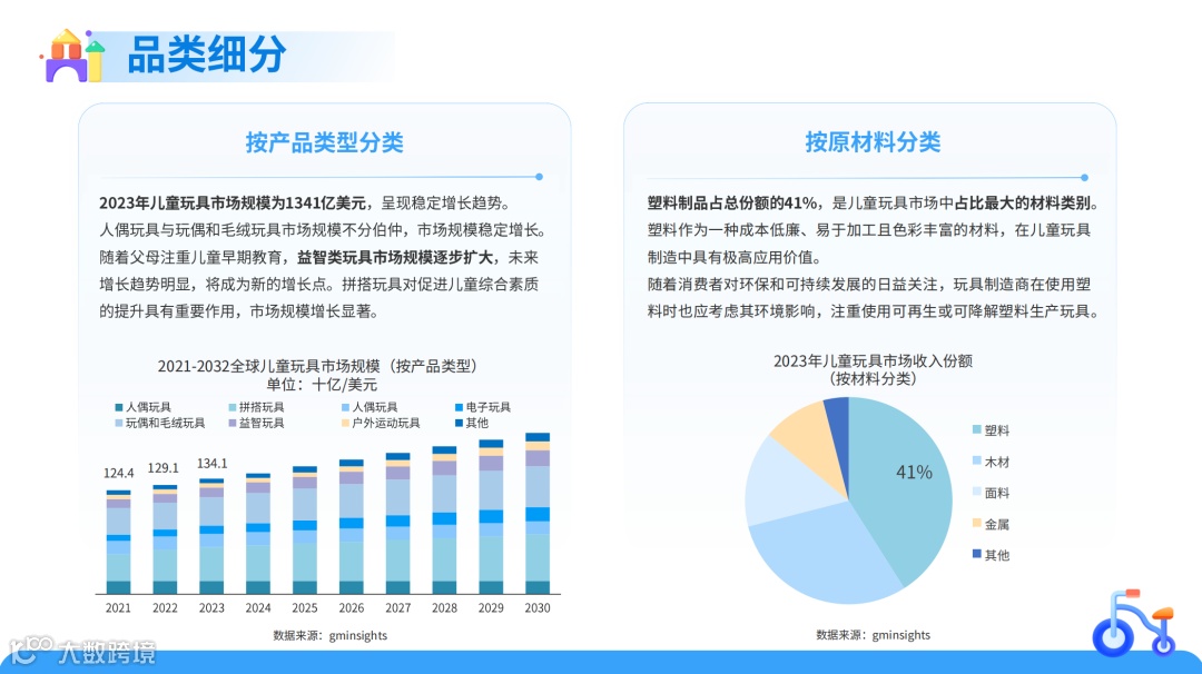 今天分享一期儿童玩具的调研数据,从市场概况、热门地区、消费者洞察、行业前景、品牌案例五个维度切入,洞察进入玩具市场的切入点。所选产品未系统化做过专利调研,所有数据仅供参考,不做开发推荐。