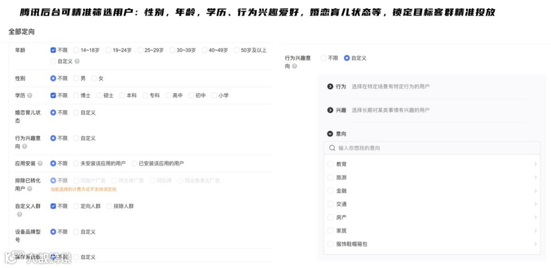 腾讯广告有专业的广告投放后台,可以供给商家在投放朋友圈广告的时候进行广告精准的定向,基础定向如:地区、性别、年龄、学历、婚育状况、消费能力等等,把广告精准投放给对应人群。而且微信还会通过三个维度给用户打标签,深度的挖掘用户的需求: