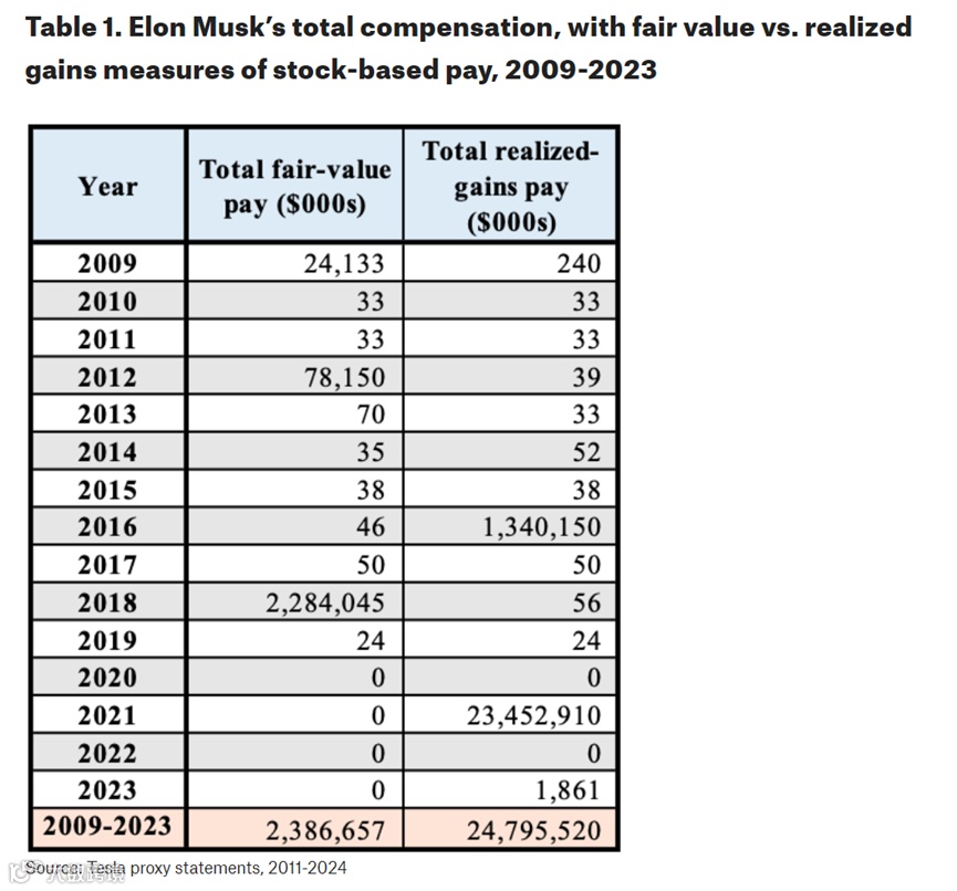 △图:马斯克2009-2023总薪酬,金额较大年度均为期权行权所得