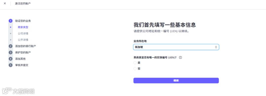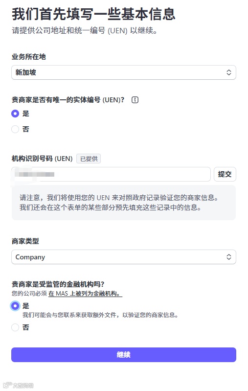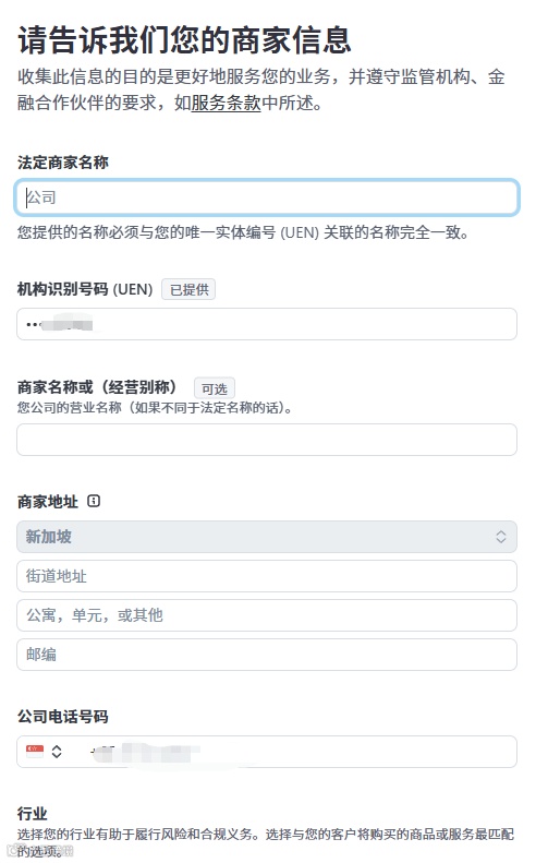 填写公司信息:公司名、地址、注册编号(UEN)、业务类型等 -