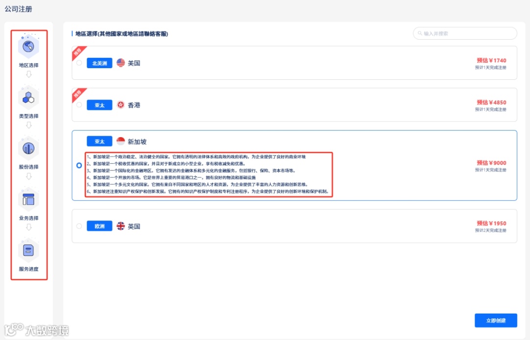 注册后进入后台,功能区直接点注册公司-新加坡公司,选择“立即创建”