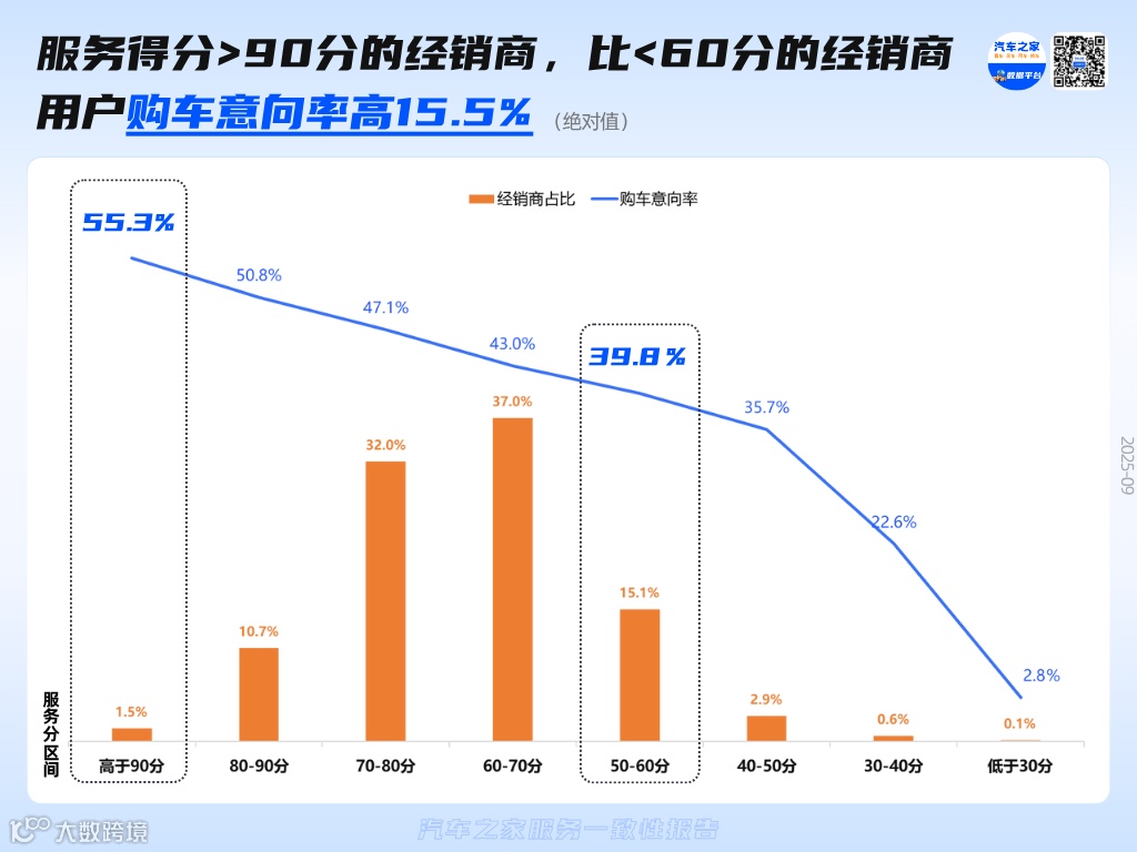 服务得分大于90分的经销商,比小于60分的经销商,用户购车意向率高15.5%(绝对值)九月