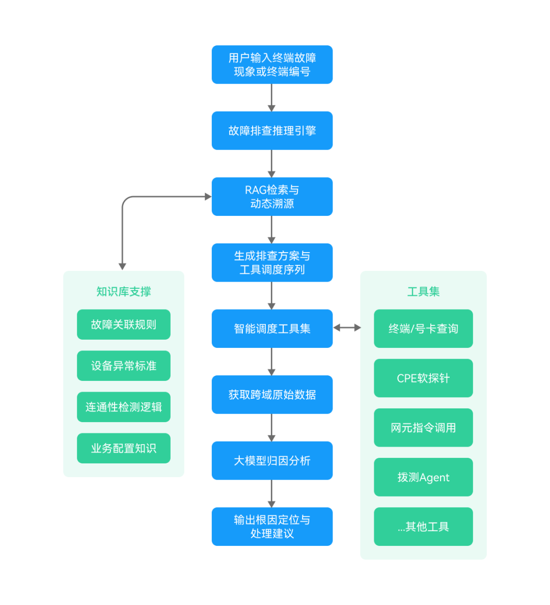 终端排障智能体以大模型为核心,整合终端排障知识库与工具集,实现终端故障的“自动识别-方案生成-执行排查-结果输出”全流程自动化,覆盖CPE 终端、5G 物联卡等多类型终端,大幅缩短故障排查时间。