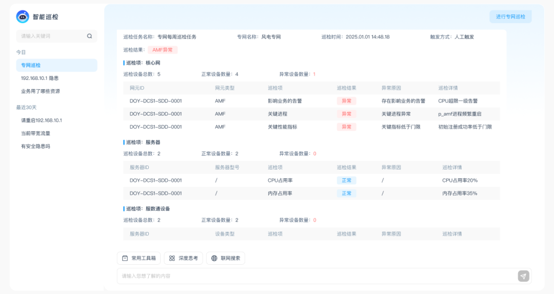 智能体具备专网维度全量巡检、分专业维度巡检、设备维度精准巡检等不同维度的巡检能力,满足不同运维场景需求。