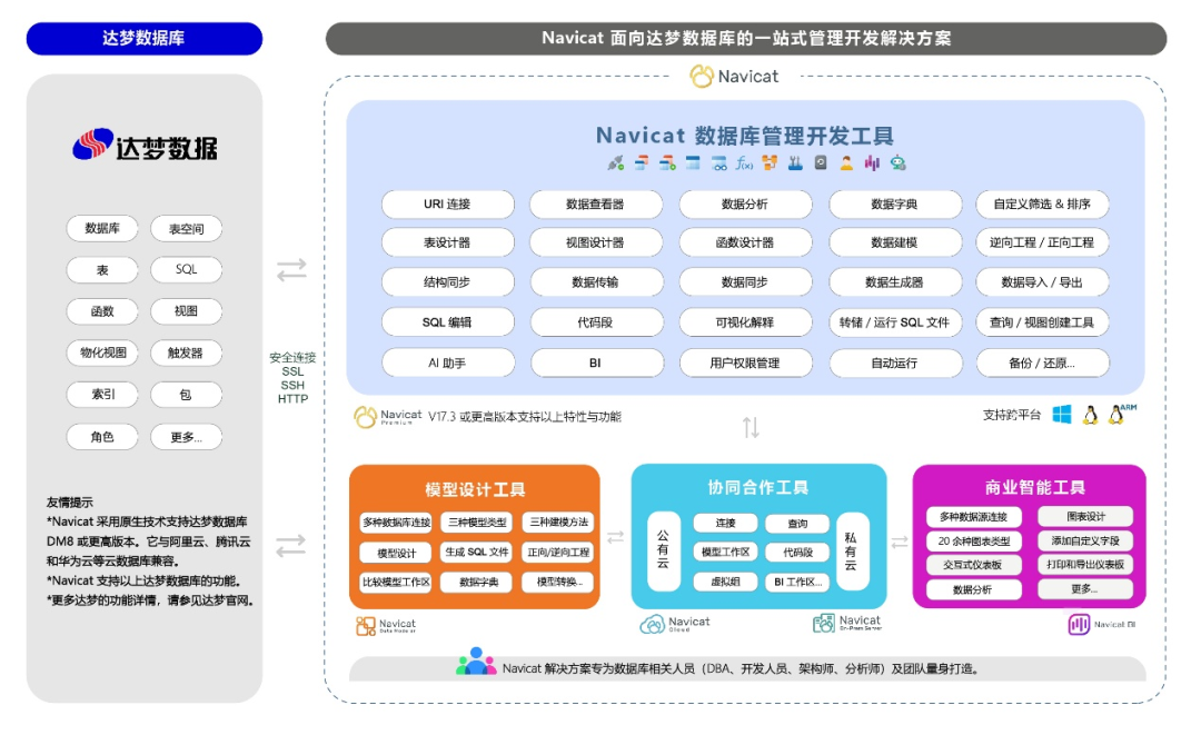 自 17.3 版本起,Navicat 旗舰级全能工具 Navicat Premium 正式支持达梦数据库管理系统DM8 或以上版本。通过Navicat原生技术与直观的 UI 设计,用户可轻松实现 AI 助手、数据导入导出、查询、备份、自动化、数据传输、数据生成、数据字典、数据同步、结构同步、服务器监控、数据查找、模型设计、商业智能及协同合作等丰富功能,全面覆盖数据库管理开发的各个环节。此外,它还支持 Windows 与 Linux 两大主流平台,确保跨平台一致的使用体验。同时,轻量化管理工具 Navicat Premium Lite 也接入达梦数据库,为小型团队与独立开发者提供专业且免费的工具选择,让更多轻量级用户享受技术红利。