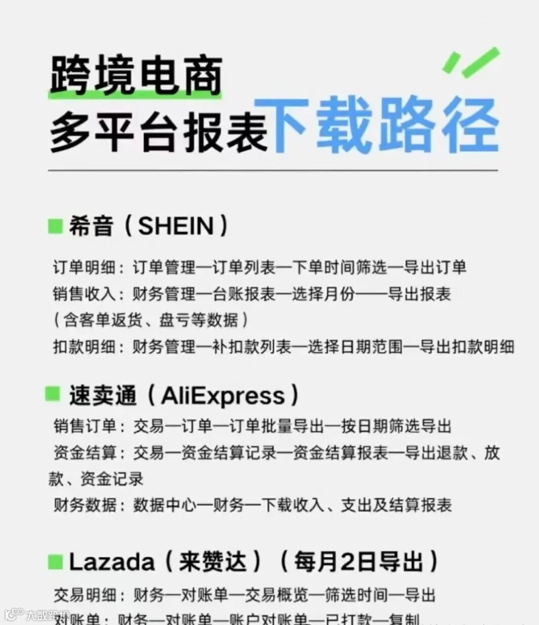 东南亚市场的平台有明确的“固定导出日”:Shopee(虾皮) 和Lazada(来赞达) 均在每月2日开放报表导出,前者从“我的订单-全部”筛选时间,后者则需通过“财务-对账单”获取交易数据
