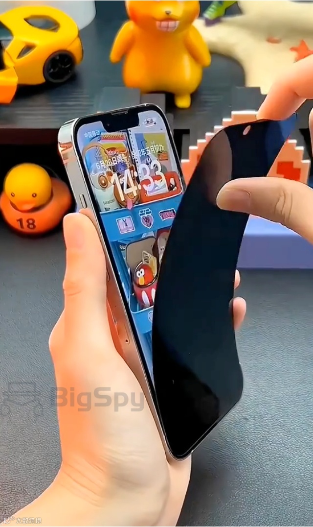 一款防窥手机膜的广告,通过弯折贴膜、左右翻转、滴落液体、手指触摸、倒烟灰、往钉板上磨擦、往玻璃杯上磕等一系列操作来体现这款手机膜防窥、延展性好、防粘防磨防撞等功能。24秒的视频里展示的功能非常全面,几乎可以说呈现了这款产品的全部优势。