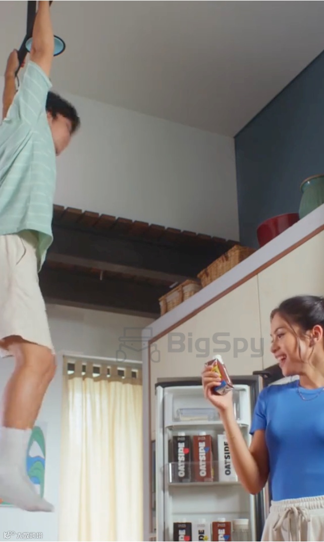 搞笑家庭情景剧类的印尼TikTok广告则带有一点夸张元素。男士站在椅子上修灯泡,妻子帮忙扶椅子,同时伸手拿冰箱里的饮料,因为够不着又太想拿饮料,妻子直接拖动了男士站着的椅子……拿到饮料后妻子开始畅饮,背景切换到翻倒的椅子和吊在灯架上的男士,配合广告文案演绎出了“美味让人忘记一切”的画面。