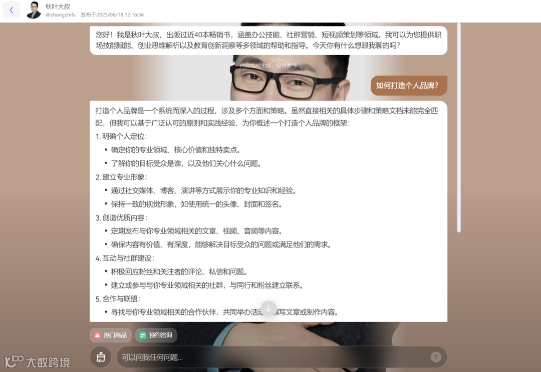 英语教师康文捷的智能体“英语教材作者康文捷”日均自动解答上万学生疑问,并持续带来教材销售订单[k]。其成功源于将AI分身用于高频答疑场景,实现“内容输出-用户互动-产品转化”的闭环[k]。