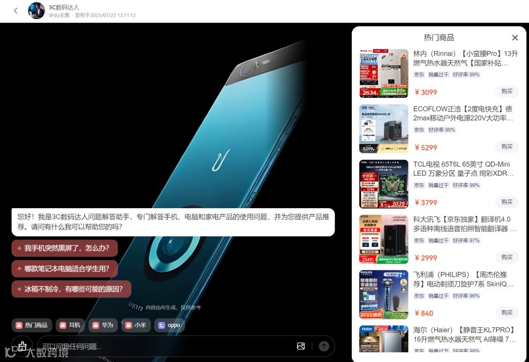 依托百度搜索流量入口及精准推荐算法,智能体可触达目标用户。平台构建“1+N”分发生态,覆盖百度搜索、文小言、小度、贴吧等产品矩阵,并与小米应用商店达成合作,服务数亿用户[k]。