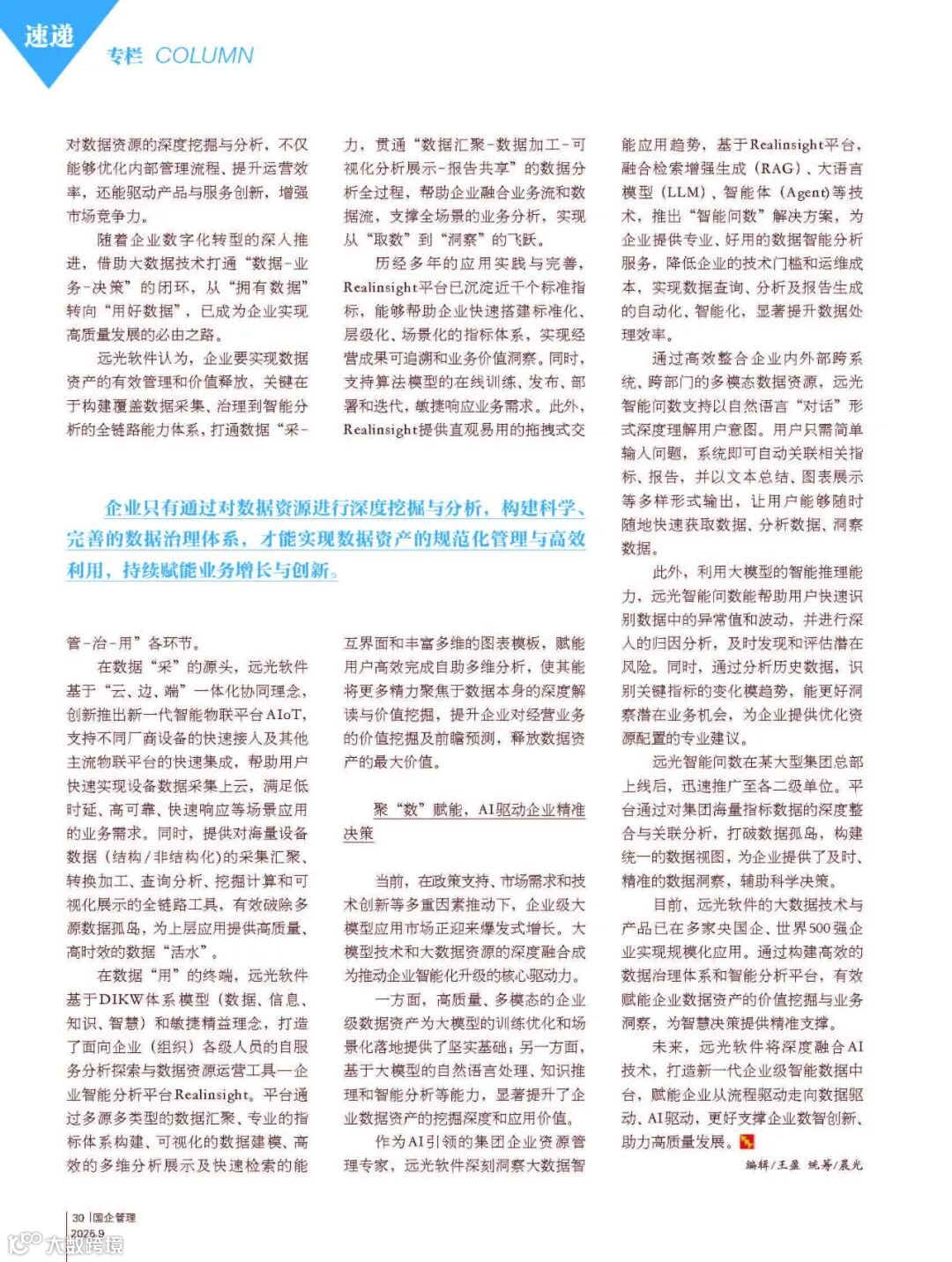 远光软件认为,企业要实现数据资产的有效管理和价值释放,关键在于构建覆盖数据采集、治理到智能分析的全链路能力体系,打通数据“采-管- 治- 用”各环节。