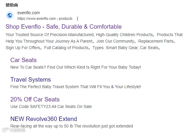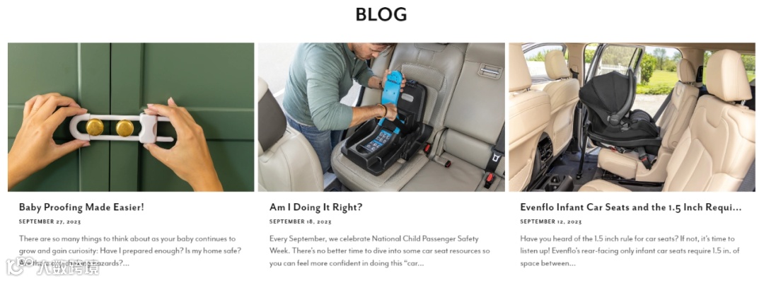 根据similarweb数据显示,Evenflo官网的流量主要来自于自然搜索流量(41.74%)、直接访问流量(28.06%)、付费搜索流量(18.58%)以及显示广告(6.66%)。(来源:similarweb) Google广告:搜索Evenflo投放的付费关键词,我们就可以看到其所投放的搜索广告。对于父母而言,婴儿车最重要的就是质量,因为这直接关系到孩子的安全与否。Evenflo在广告中针对用户痛点,反复强调高品质、值得信赖的品牌特点,这是能够吸引消费者的注意的。此外,Evenflo还在广告中提到了“Replacement Parts”和“20% Off Car Seats”,即替换部件和特价优惠,完善的售后保障和折扣优惠是能够促使消费者点击并购买的。博客营销:长文博客既是加深消费者对产品、品牌认知的有效手段之一,也是SEO优化的重要组成部分。Evenflo在官网内持续更新与婴幼儿相关的干货知识、产品介绍等相关文章,这些正是新手父母或潜在消费者最为关心的内容,因此这是能为网站带来更多流量的。