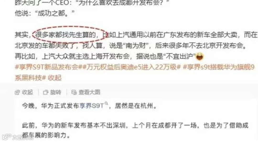 近日,据某汽车博主爆料,车企喜欢去成都开发布会,是为图个“成功之都”的吉利;而上汽通用迷信“南方聚财”,将广东发布会销量奇迹归功于“南为财”的玄学布局;上汽大众则坚守“不宜出沪”,主选上海开发布会。这些看似荒诞的选址逻辑,正在行业内悄然蔓延。