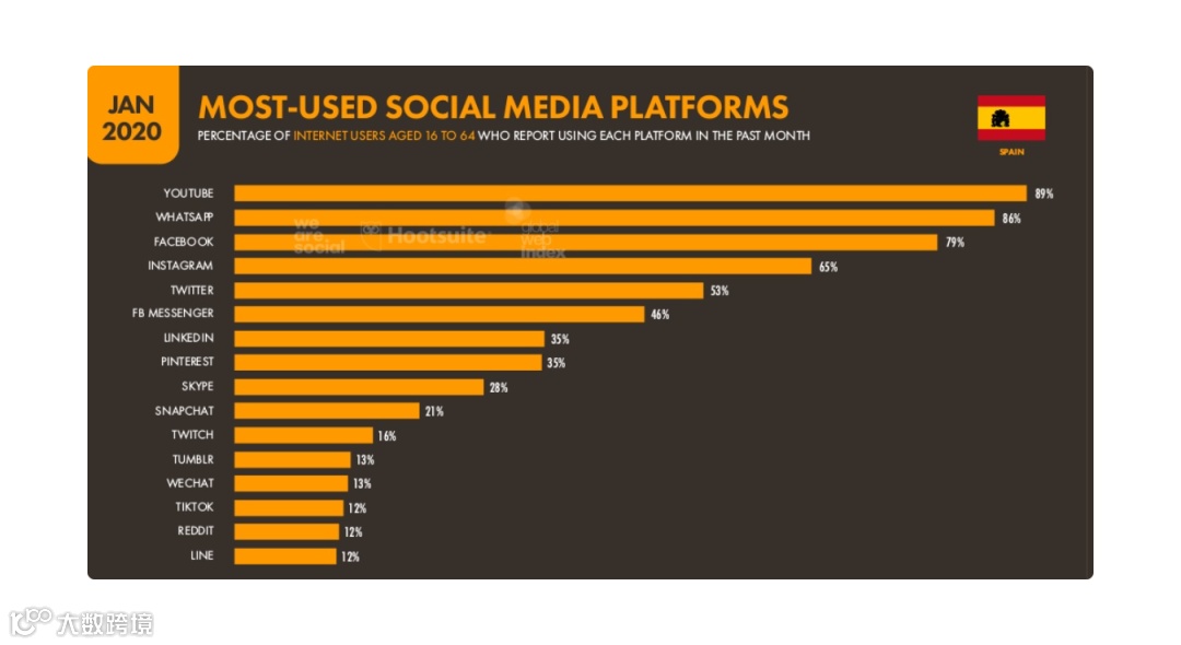 调查还显示,2023年,西班牙一半以上的电商专业人士已利用Facebook来营销,而46%的商家已利用Instagram来进一步实现其业务目标。此外,商家很乐意使用WhatsApp和YouTube,大约有三分之一的受访企业在使用这两种应用。