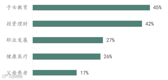 这些焦虑主要聚焦在子女教育(45%)、投资理财(42%)、职业发展(27%)、健康医疗(26%)、父母养老(17%)等。