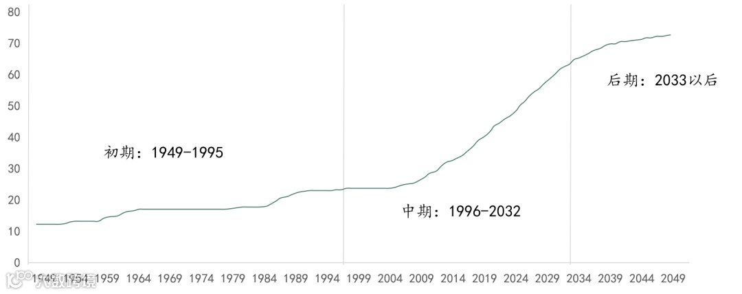 根据美国地理学家诺瑟姆对世界各国城市化的研究成果,以及中国社会的具体现状,可以发现我国城镇化初期是1949年-1995年,中期是1996年-2032年,后期是2033年以后。
