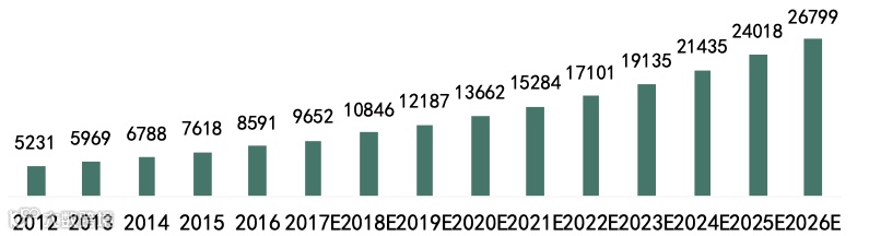 图:2012年-2026年中国大健康市场规模(人民币十亿元)