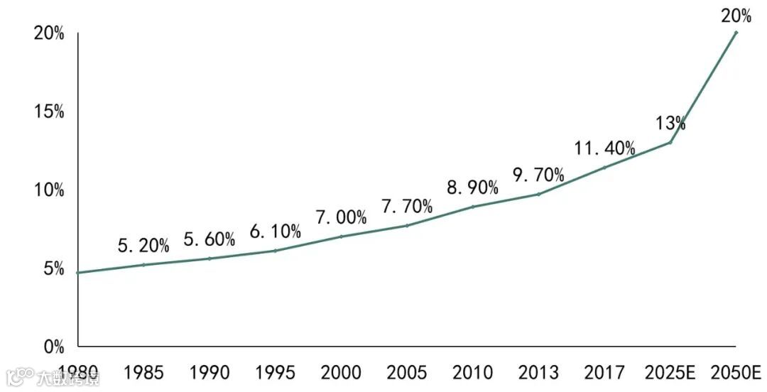 当前2018年底我国城镇人口占总人口的比重是59.58%,已经进入生长理论曲线的中期,未来增速将会减缓,但考虑到巨大的人口基数以及80%左右的预期城镇化人口比重,未来城镇化人口增量将会达到2亿以上。