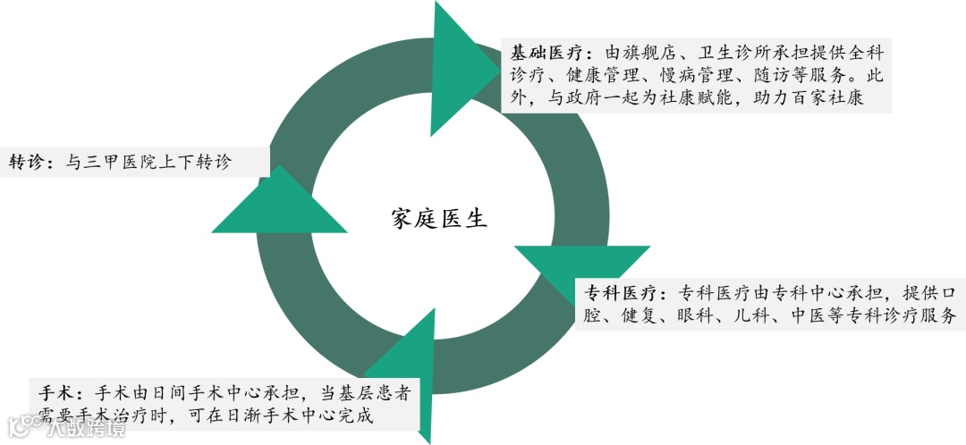 在这个模型中,基础医疗由旗舰诊所、卫星诊所承担,提供全科诊疗、健康管理、慢病管理、随访等服务,企鹅杏仁还将和政府一起为社康赋能,助力百家社康;专科医疗由专科中心承担,提供口腔、健复、眼科、儿科、中医等专科诊疗服务;手术由日间手术中心承担,当基层患者需要手术治疗时,可在日间手术中心进行;针对基础医疗、专科医疗和手术无法解决的疑难重症,向三甲医院转诊,从三甲医院出院的患者也可转至企鹅杏仁的基础医疗体系进行院外康复或管理。